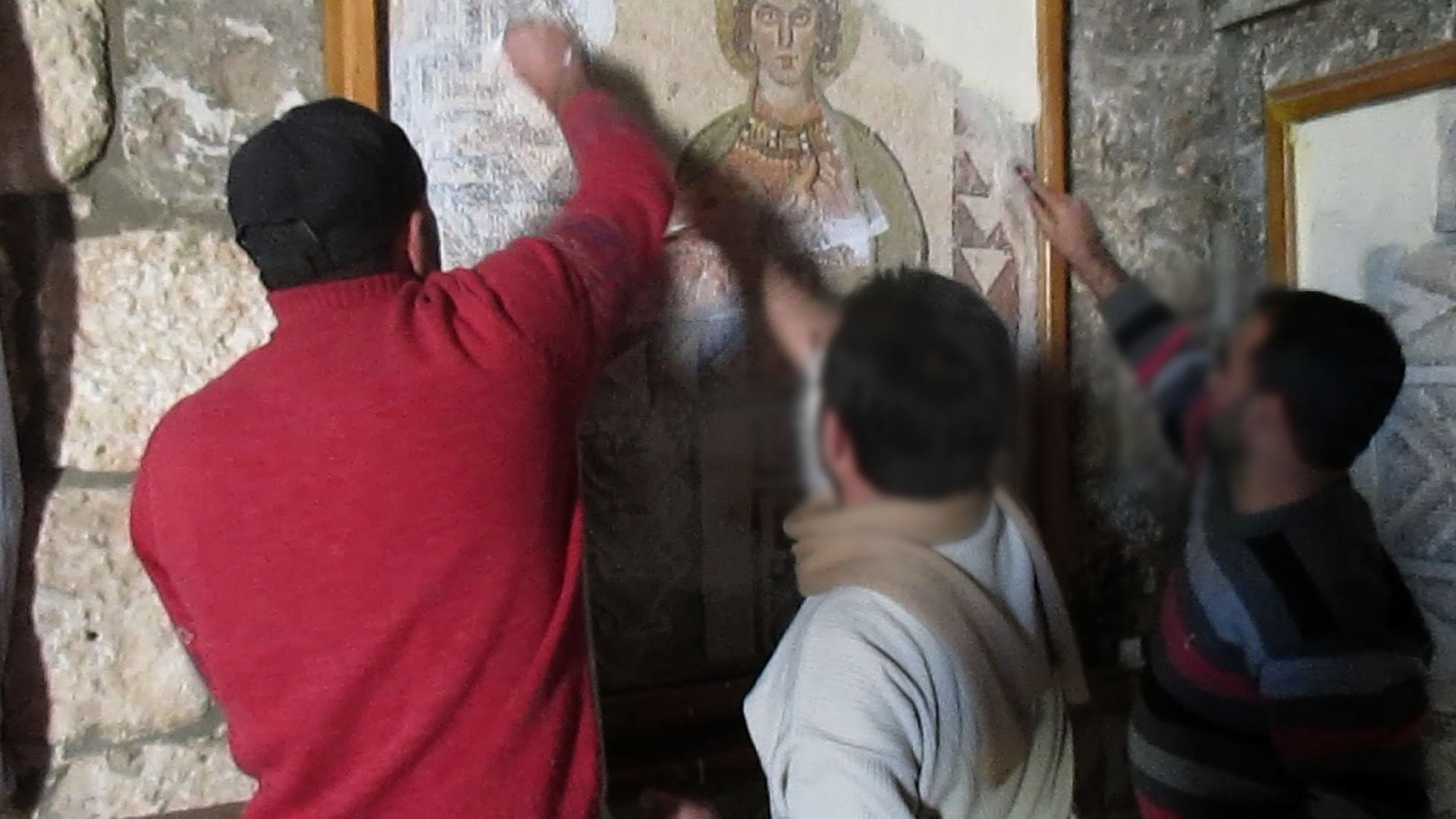 IMAGES AT TOP, L to R: DESTRUCTION at Palmyra, an ISIS image released 25 Aug 2015; PROTECTING mosaics at the Ma’arra Mosaic Museum, Syria, image © Shaker Al Shbib; REBUILDING the Ferhadija Mosque, Bosnia & Herzegovina, image by Derek Wiesehahn © Vast Productions USA;